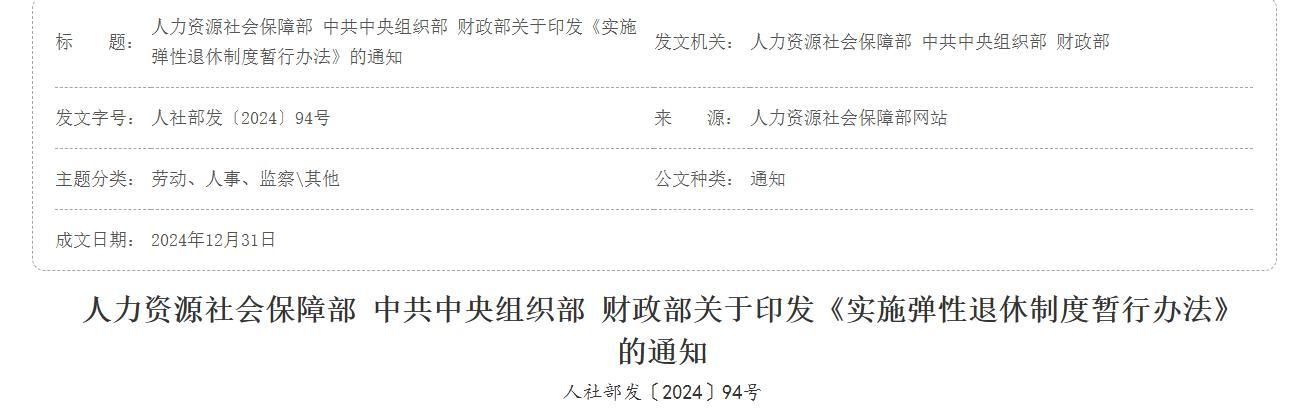 参考资料:人力资源社会保障部 中共中央组织部 财政部关于印发《实施弹性退休制度暂行办法》的通知——人社部发〔2024〕94号