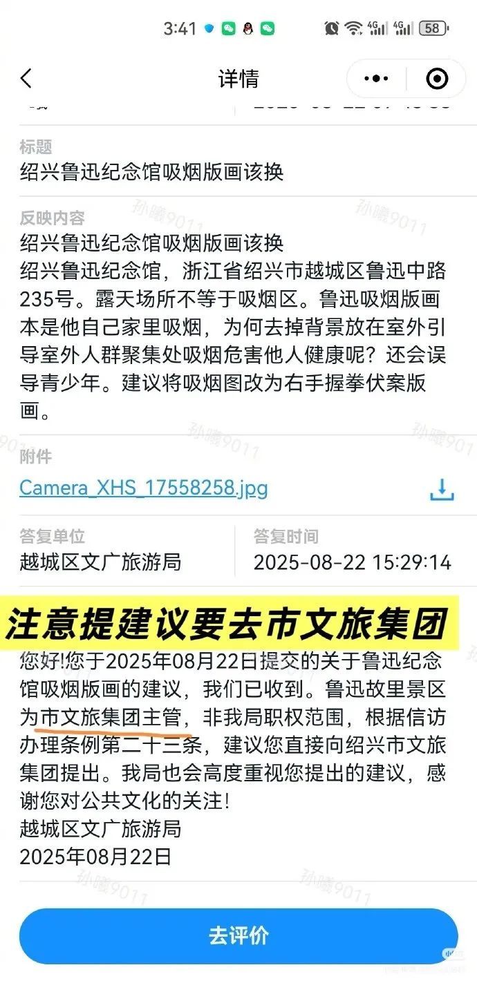 越城区文广旅游局的回复称:“鲁迅故里景区为市文旅集团主管,非我局职权范围,建议您直接向绍兴市文旅集团提出。”