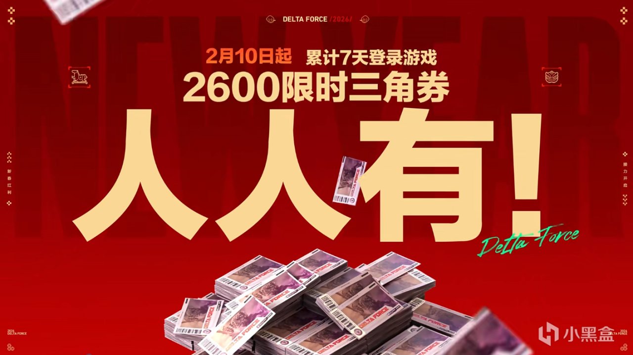 2 月 10 日起,《三角洲行动》新春福利全面开启。 有券有枪有刀皮!更有刘涛送六套! 2600 限时三角券 7 天登录送、最多 11 款传说枪械外观免费得、传说近战参与玩法免费领! 还有六套福袋、新春限定大红、百万哈夫币红包、烟花等道具等你拿!